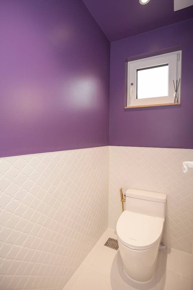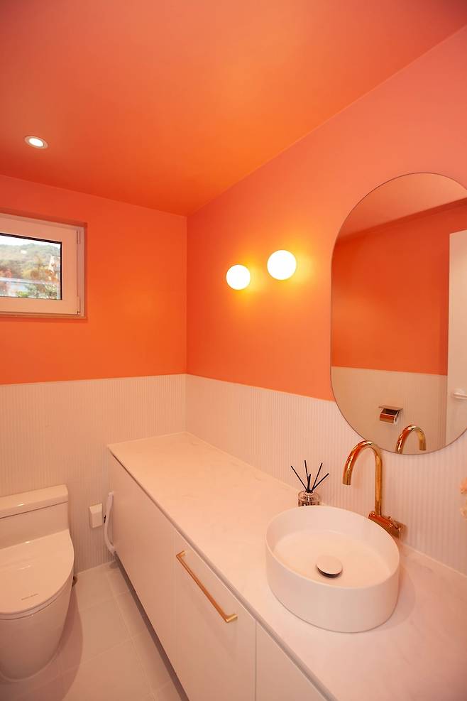 1층에는 화장실이 하나 더 있는데요. 바로 이 공용 화장실이에요. 공용 화장실은 집 전체적인 색이 화이트라서 화장실만큼은 쨍한 색감으로 만들었어요. 과감하게 피치색을 골랐는데, 오시는 손님마다 마치 카페 화장실 같다며 너무 좋아하셔서 매우 만족스러워요. 화장실만큼은 조금 과감해지는 것도 좋지 않을까요? :)