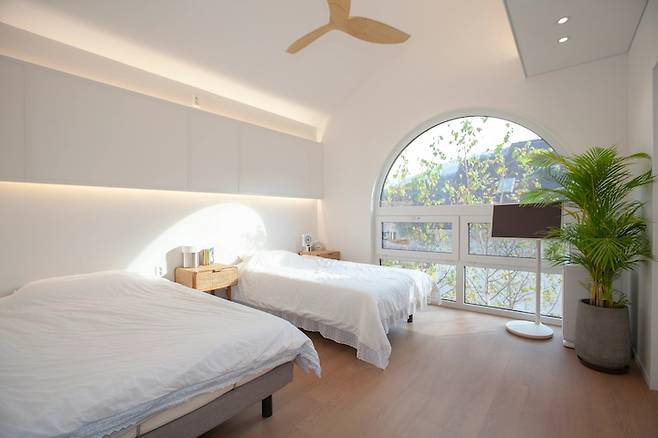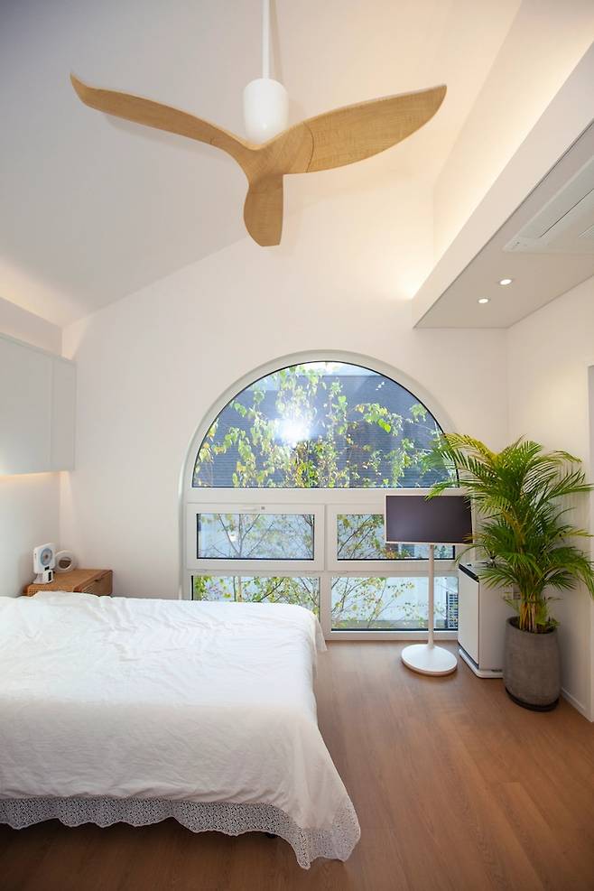2층의 안방은 저희 부부의 로망이 실현된 곳이에요. 저의 로망이었던 커다란 아치창과 실링팬, 그리고 신랑의 로망이었던 박공 지붕으로 설계했지요. 부부 각자의 수면의 질을 위해 싱글 침대를 두 개 두었고, 각자의 정리 스타일을 존중하기 위해 드레스룸도 각각 사용할 수 있도록 구성했어요.