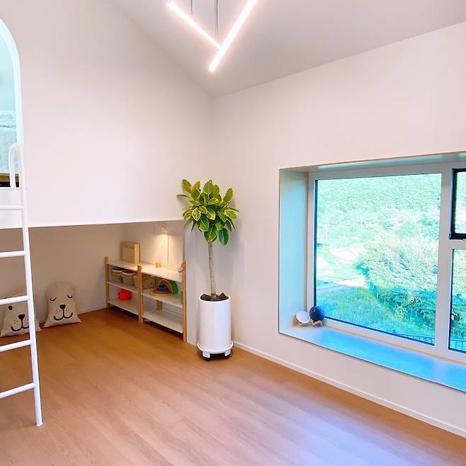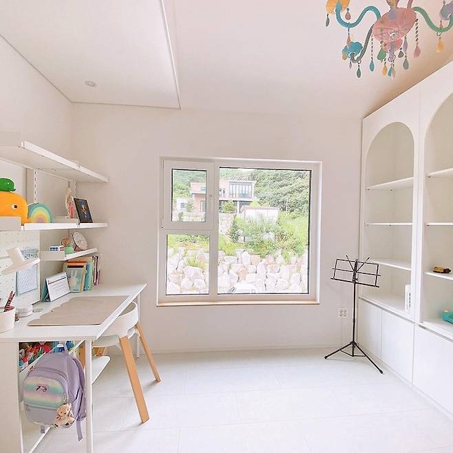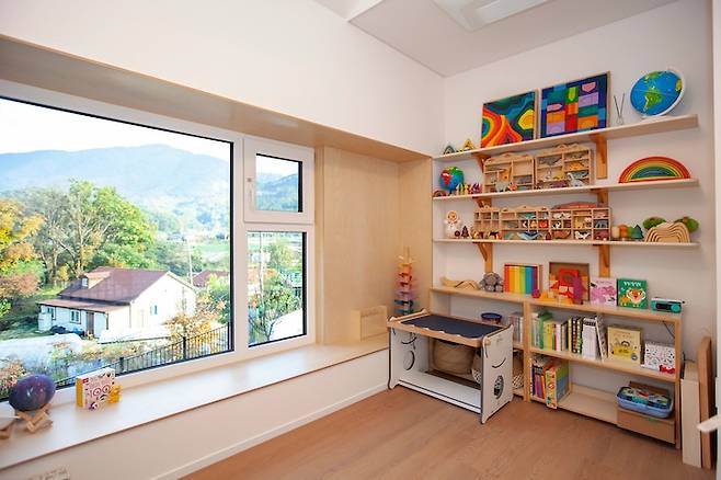 둘째 아이의 방은 저희 집에서 뷰가 가장 좋은 곳이에요. 뷰가 좋다 보니 큰 창을 내고 아이들이 앉아서 풍경과 함께 책을 볼 수 있도록 만들었어요.