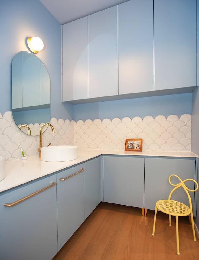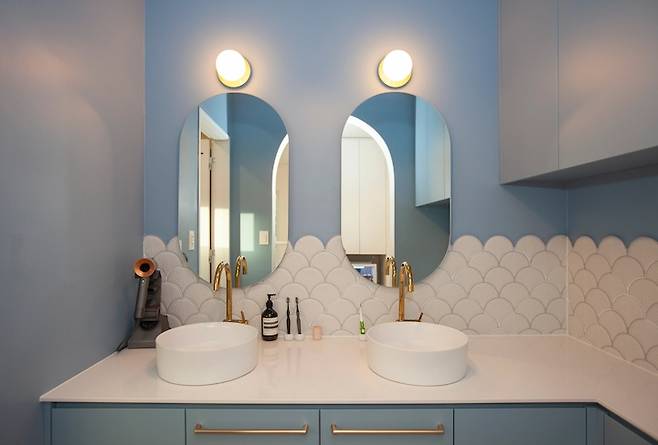 세면대 공간은 인어공주 느낌이 나도록 설계했어요. 이룸하우스에는 빠질 수 없는 아치 형태가 많이 적용된 곳이죠. 입구도, 타일도 아치형이랍니다.