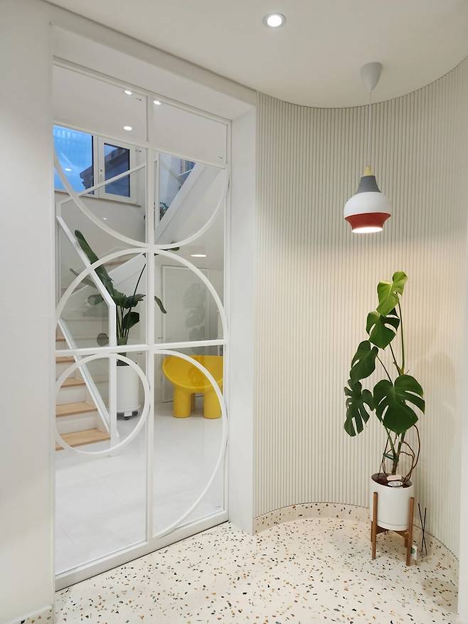 중문을 열고 들어가면 가장 먼저 보이는 곳은 2층으로 올라가는 계단과 계단실이에요. 집에 와서도 1층과 2층을 왔다 갔다 하면서 언제든지 책을 볼 수 있도록 설계했고, 포인트가 되는 의자와 회전 책상 그리고 여인초로 생기를 불어넣어 봤어요.