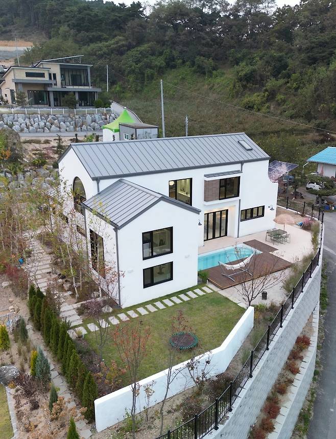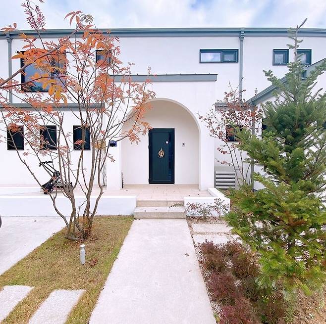 그렇게 완성된 이룸하우스입니다. 이룸하우스는 목조 주택으로 지었고요. 전체적인 외부 마감은 스타코플렉스, 지붕은 리얼 징크로 마감하였는데요. 지붕색은 흰색으로 할까 회색으로 할까 정말 많은 고민 끝에 관리가 조금 더 용이한 회색으로 선택했어요.