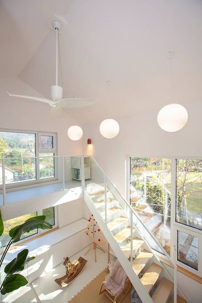 그래서 어떻게 하면 좋을지 고민이 많았는데요. 저희 부부와 아이의 로망을 모두 실현 시킬 수 있도록, 높은 천장을 위해 일부를 박공 지붕으로 만들고, 대신 침실 공간을 복층으로 만들어 주었어요.