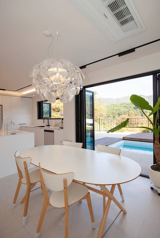 주방과 다이닝은 창문이 모두 폴딩 도어이고, 도어를 열면 외부 수영장과 연결돼요. 수영장에서 수영하다가 바로 들어와서 음식을 먹기도 하고, 커피를 마시며 아이들이 수영하는 모습을 보기도 하는 등 서로 연결된 공간으로 구성했어요. 폴딩 도어를 열면 집과 마당의 단차가 없는 것도 하나의 특징이에요.