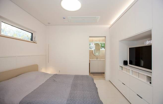1층 침실은 주로 부모님이 방문할 경우에 많이 사용되어요. 특히 친정아버지가 휠체어를 타시기 때문에 화장실과 방문에 단차를 없애고 휠체어가 다니기 좋은 공간으로 구상했어요. 또 언제든 아이들이 노는 모습을 볼 수 있도록 슬라이딩 양개형 도어를 설치했어요. 분리된 공간이지만 거실부터 다목적 공간까지 연결되어 개방감이 좋은 곳이기도 해요.