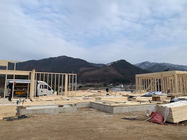 점차 우리가 설계한 도면대로 조금씩 모습이 드러날 때면 너무 신기하고 설레었던 기억이 나네요. 골조가 생겨나고 집의 외관이 어느 정도 드러났을 때는, 주말이면 캠핑 의자를 가지고 가서 라면도 끓여 먹으며 앞으로의 마당 생활을 미리 경험해 보기도 했어요.