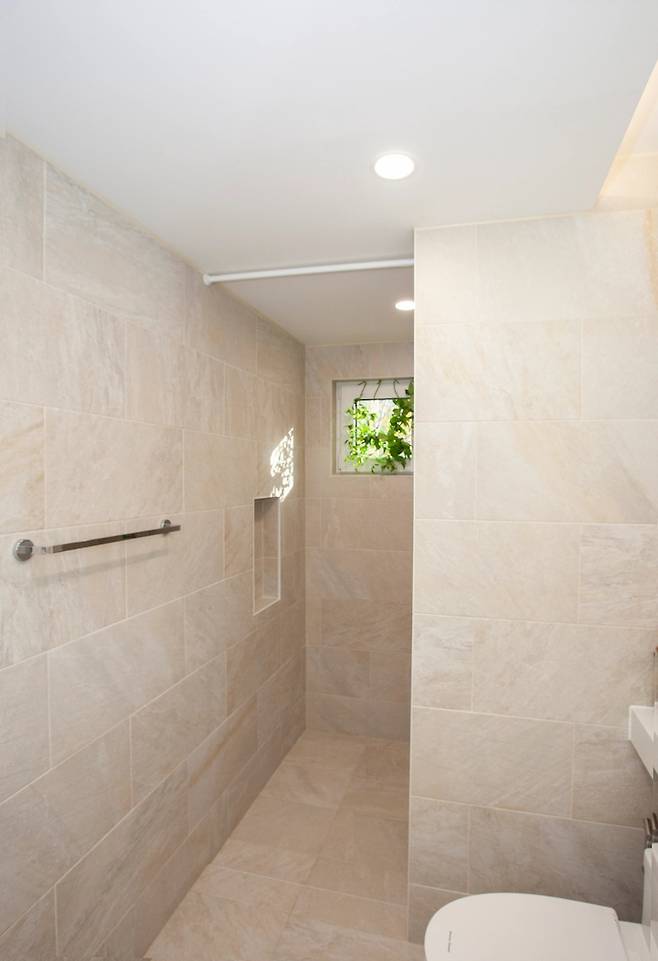 1층 침실과 연결된 화장실이에요. 이곳의 특징이라고 한다면 창이 위쪽에 길게 나있어서 빛이 잘 들어오고, 바깥 풍경이 보인다는 점이에요.