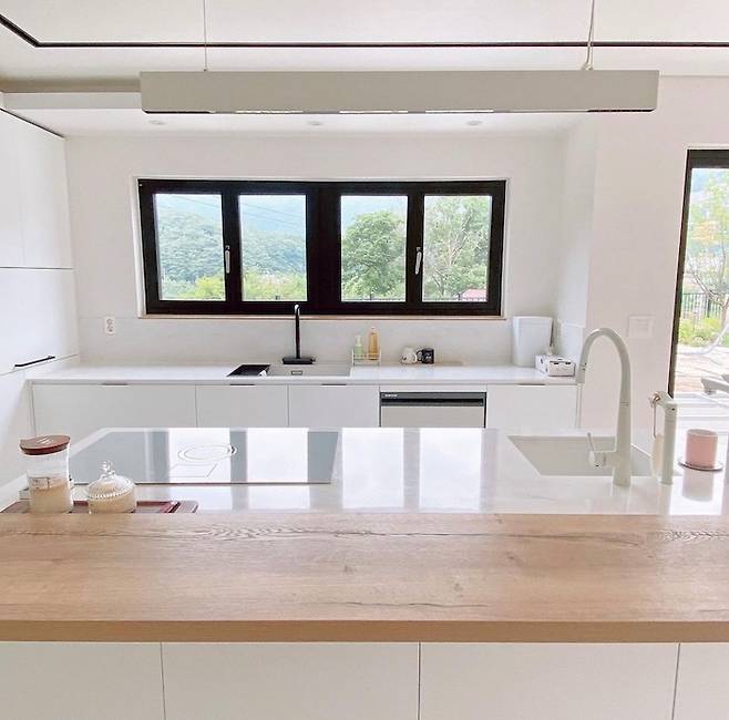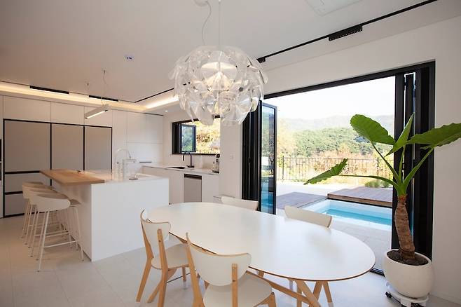 싱크대 쪽 폴딩 도어를 열면 밖에서 바비큐 파티를 할 때 음식을 내보내기도 좋아요. 마치 작은 카페처럼요. 무엇보다 식탁에서 보이는 풍경이 저희 집 최애 풍경 스팟이랍니다.