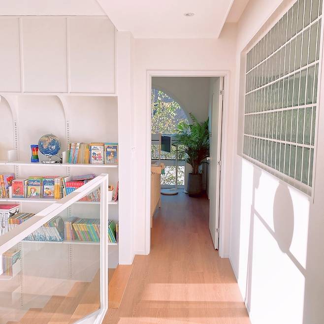 계단실은 공간을 크게 만들어서 양쪽 벽에 책장을 넣어 두었더니, 아이가 오며 가며 책을 읽더라고요. :)