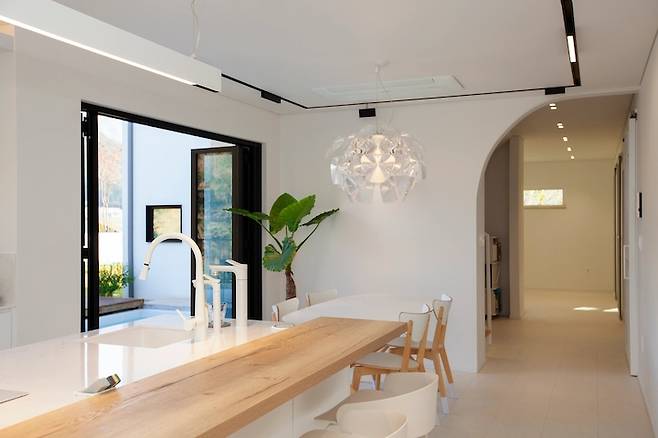 주방과 다이닝은 창문이 모두 폴딩 도어이고, 도어를 열면 외부 수영장과 연결돼요. 수영장에서 수영하다가 바로 들어와서 음식을 먹기도 하고, 커피를 마시며 아이들이 수영하는 모습을 보기도 하는 등 서로 연결된 공간으로 구성했어요. 폴딩 도어를 열면 집과 마당의 단차가 없는 것도 하나의 특징이에요.