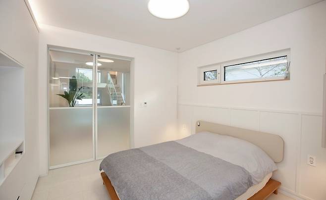 1층 침실은 주로 부모님이 방문할 경우에 많이 사용되어요. 특히 친정아버지가 휠체어를 타시기 때문에 화장실과 방문에 단차를 없애고 휠체어가 다니기 좋은 공간으로 구상했어요. 또 언제든 아이들이 노는 모습을 볼 수 있도록 슬라이딩 양개형 도어를 설치했어요. 분리된 공간이지만 거실부터 다목적 공간까지 연결되어 개방감이 좋은 곳이기도 해요.