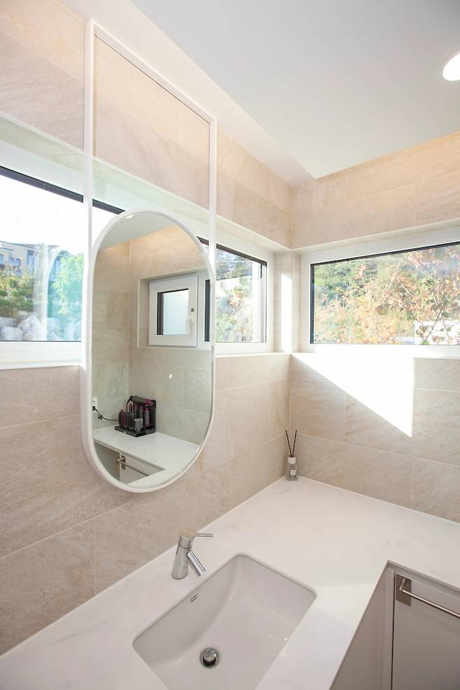 세면대 공간은 인어공주 느낌이 나도록 설계했어요. 이룸하우스에는 빠질 수 없는 아치 형태가 많이 적용된 곳이죠. 입구도, 타일도 아치형이랍니다.