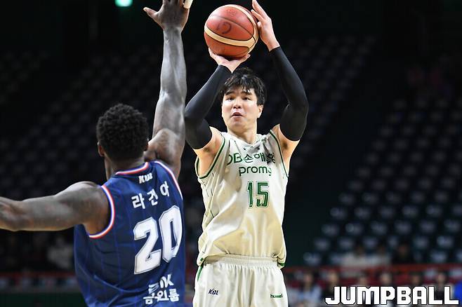 [점프볼=부산/박상혁 기자] 15일 부산사직체육관에서 열린 2023-2024 정관장 프로농구 부산 KCC와 원주 DB의 경기, DB 김종규가 슛을 시도하고 있다.