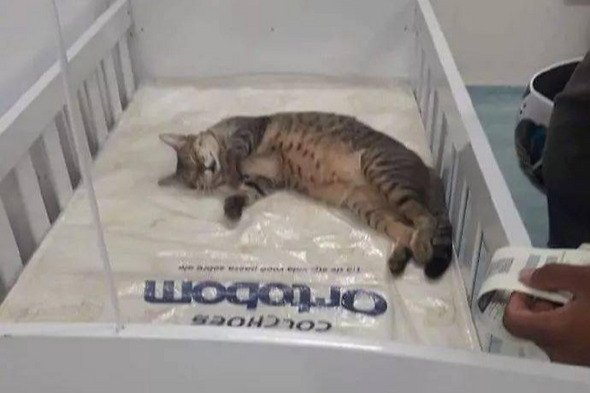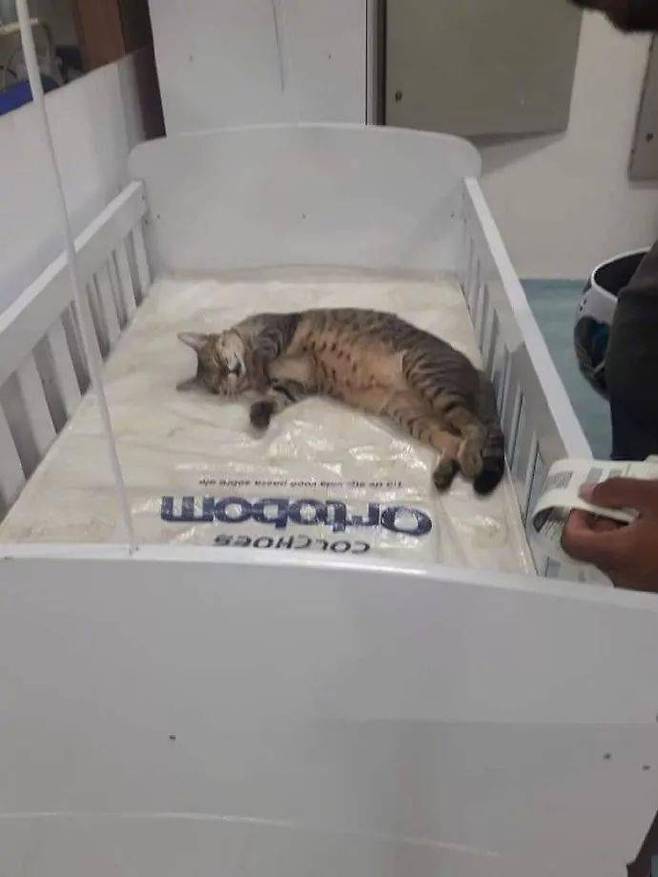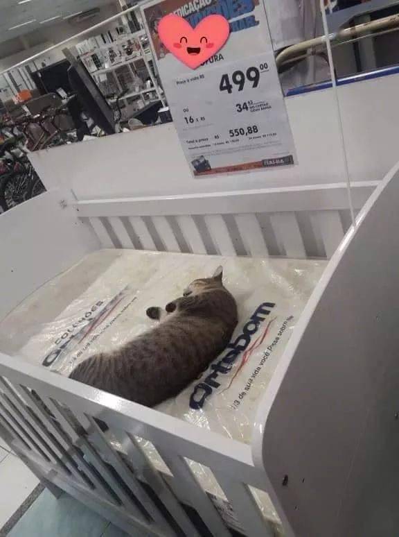 그런데 진열된 아기 침대 위에 한 마리의 고양이가 아무런 신경 쓰지 않고 편안하게 잠들어 있는 모습을 발견했습니다.