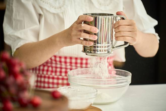 4. 박력분(또는 중력분) 베이킹파우더, 베이킹 소다, 소금을 채친다.