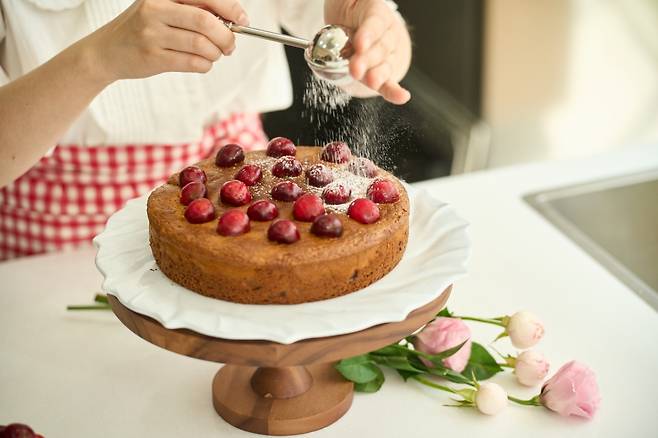 8. 슈가파우더를 뿌려서 장식해 완성한다.