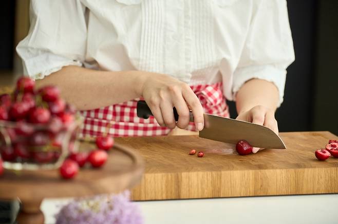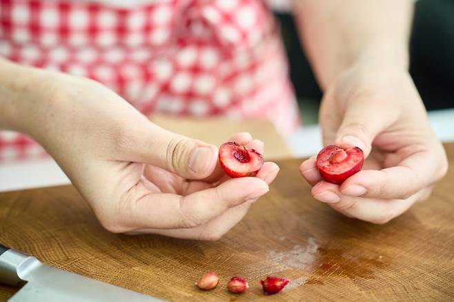 3. 토핑용 체리(150g)는 씨를 중심으로 칼집을 넣은 후 씨를 뺀다.