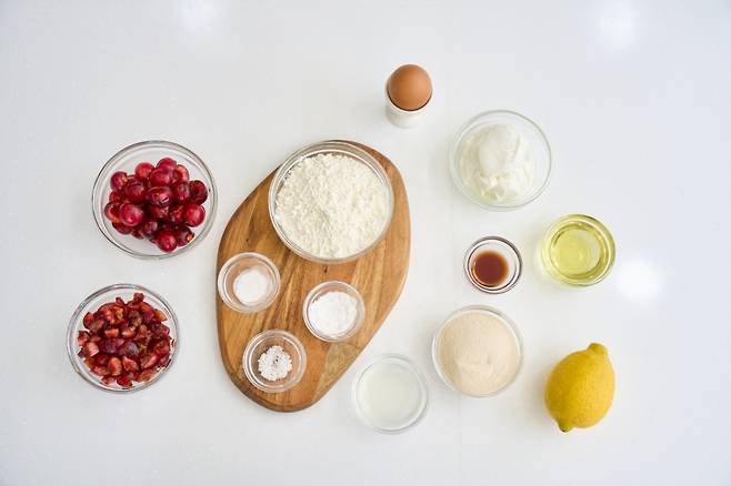씨를 뺀 체리 250g, 박력 또는 중력분 150g, 베이킹파우더 5g, 베이킹 소다 1g, 소금 1g, 무가당 그릭 요거트 150g(실온), 식물성 오일 50g, 계란 1개(실온), 설탕 100g, 레몬즙 2큰술, 레몬 제스트(레몬 1개 분량), 바닐라 익스트랙트 1작은술 (생략 가능)