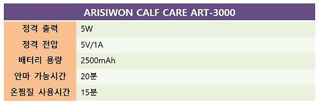 현대인의 다리는 혹사당하고 있다. 출퇴근 시 대중교통을 이용하면서 서 있게 되고, 업무 시간에도 앉거나 서 있는 상태로 장시간 근무하느라 피로가 쌓인다. 걸어서 이동하는 거리가 길거나 경사진 곳을 오간다면 피로가 가중되며, 여기에 구두를 신고 일한다면 퇴근 후 꼼짝하기도 힘든 상태가 된다. 아리시원 종아리 마사지기계 ART-3000은 피로한 종아리를 집에서 간편하게 마사지해주는 장치이다.