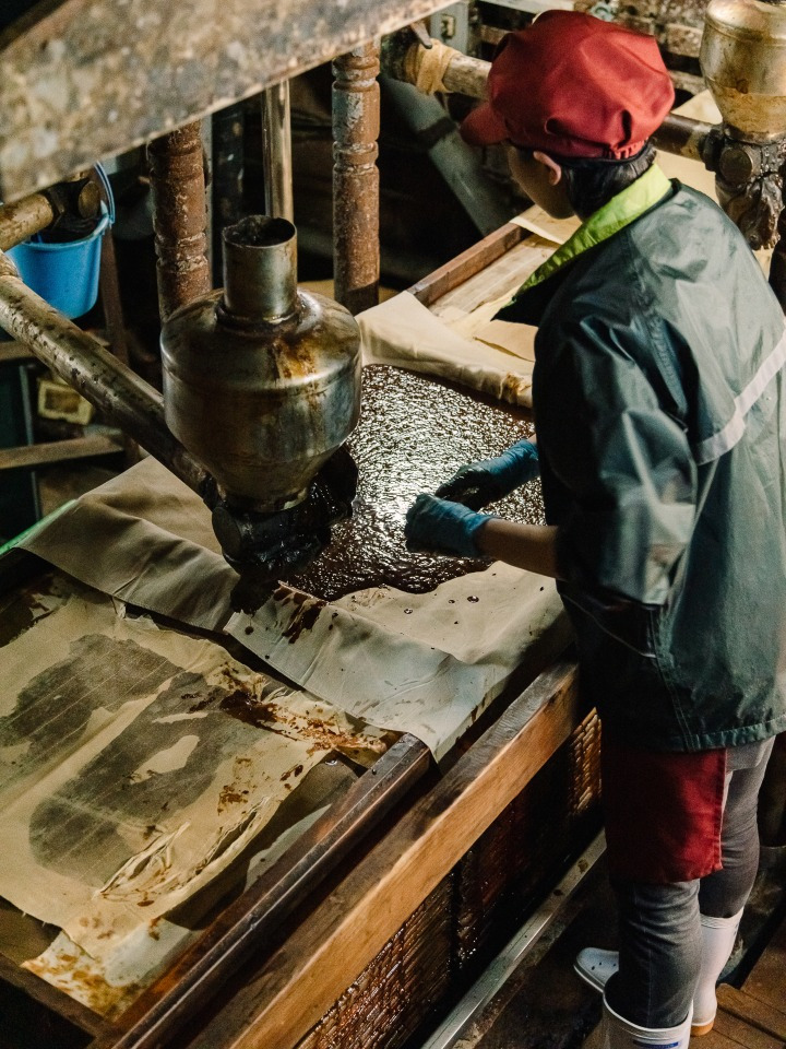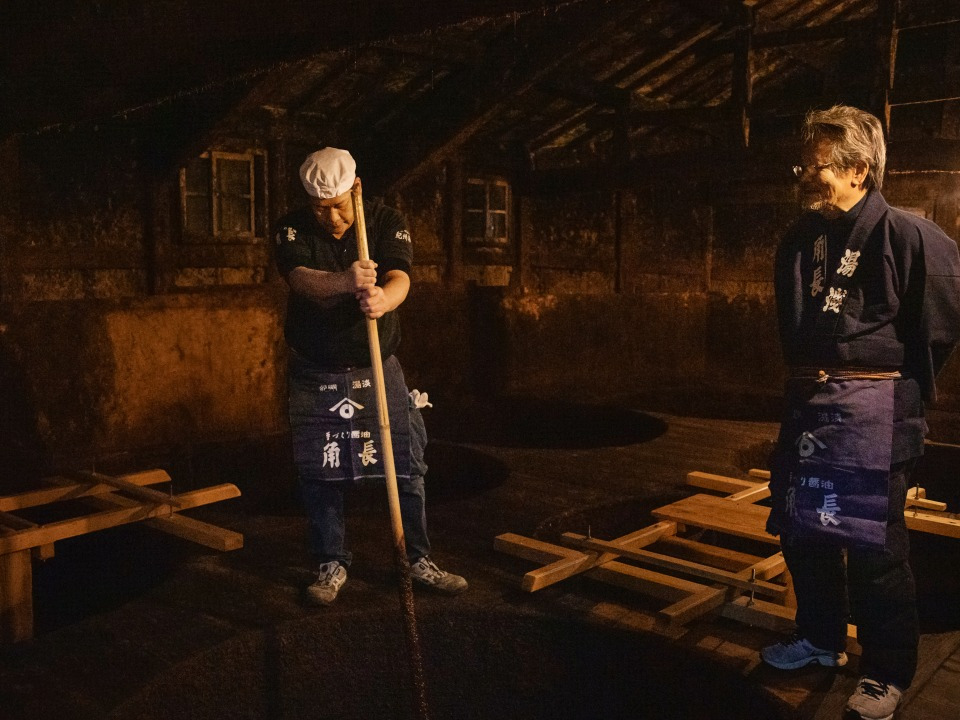 마을에는 사위가 가업을 잇는 양조장이 하나 더 있다. 유아사에서 유일하게 180여 년 전 선조의 방식을 따라 수제 간장을 생산하는 가도초(角長)다. 대부분의 간장이 대량 생산되는 오늘날에도 가도초는 첨가물을 전혀 사용하지 않은 수제 간장 양조를 고수한다.“간장 만드는 사람입니다.” 가도초의 6대 운영자인 가노 마코토(加納誠)가 서툰 한국어로 본인을 소개한다. 아들, 딸과 함께 양조장을 운영하는데, 자신은 패키지를 접고 손님을 응대하는 등 주로 매장에서 시간을 보낸다고. 에도 시대부터 사용했다는 창고 안으로 들어서니 커다란 나무통 안에 4년 이상 숙성 중인 까만 간장이 가득 담겨 있다. 온도와 습도의 미묘한 변화가 간장의 맛을 결정하기 때문에 긴 막대기로 나무통 안 내용물을 자주 섞어주며 맛을 유지한다고. 이런 제조 방식이야말로 기계로는 표현할 수 없는 가도초만의 재산일 테다.