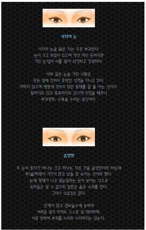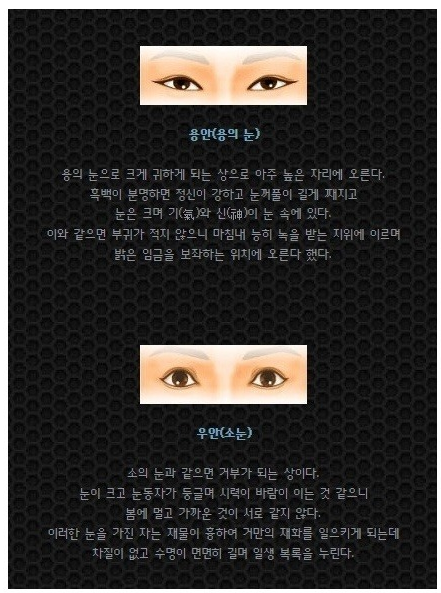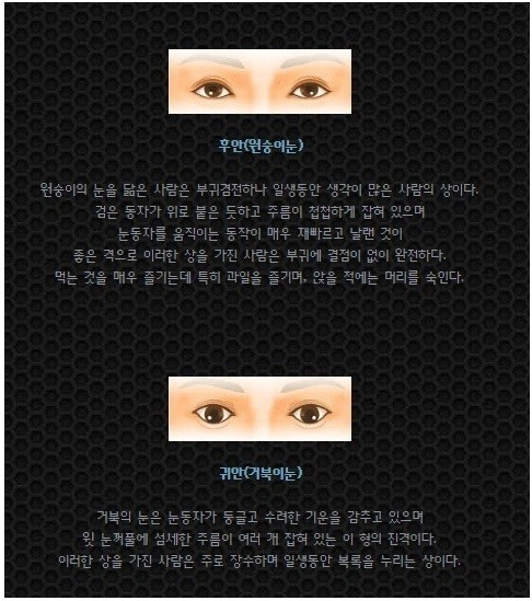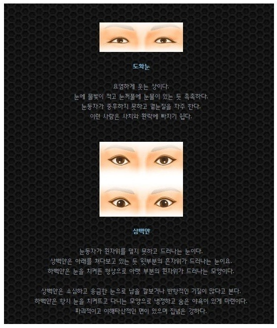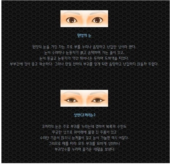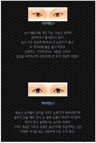눈은 관상학에서 ‘심상(心相)’이라 불릴 정도로 매우 중요한 부위입니다.사람의 성격, 지능, 성향, 운세, 인간관계, 복 등을 판단할 수 있는 핵심 포인트죠.