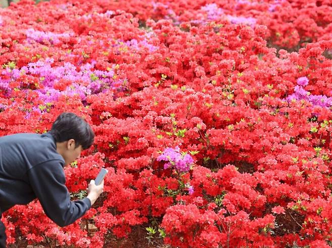 호수 위 섬 하나가 붉게 타오른다. 바람에 흔들리는 철쭉 꽃잎은 마치 불꽃처럼 피어오르고, 그 아래로는 물결처럼 흔들리는 다리가 그 풍경 속으로 발걸음을 이끈다.