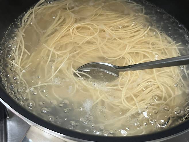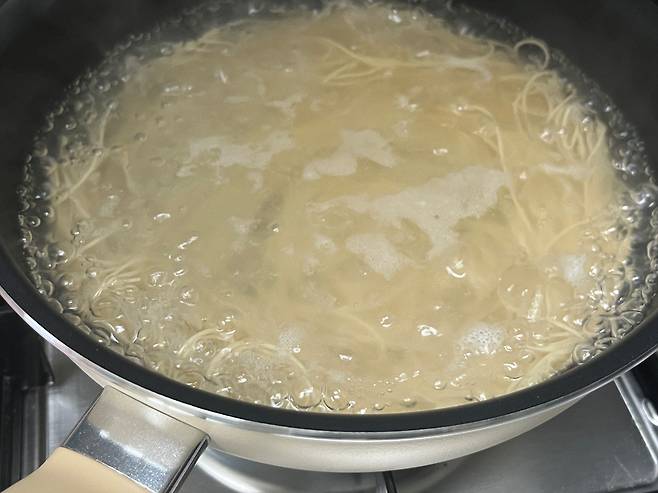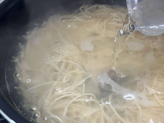 국수는 전분이 많아 중간에 거품이 끓어 넘치는 경우가 많습니다. 이때, 놀라서 불을 끄지 마시고 찬 물 반 컵만 부어 보세요. 거품이 사라집니다.