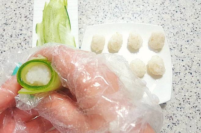 양념한 밥은 오이 속에 쏙 들어갈 한입 크기로 동글동글 말아줍니다. 밥을 말 때는 설탕이 들어가 밥이 달라붙으니 물을 묻혀가며 말아주시면 됩니다. 그다음 뭉쳐진 밥을 절여진 오이로 돌돌 말아주세요.
