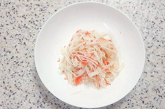 오이가 절여지는 동안 크래미를 잘게 찢어 주신 뒤 마요네즈, 머스터드 소스, 후추 약간 넣고 양념합니다.