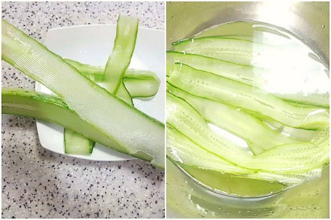 먼저 소금으로 오이 겉면을 씻어 주시고요. 감자칼을 이용해 힘을 주어 끊어지지 않게 끝까지 얇게 슬라이스 해 줍니다. 오이가 숨이 죽어 잘 말아지도록 소금물에 5분 정도 담가 주세요.