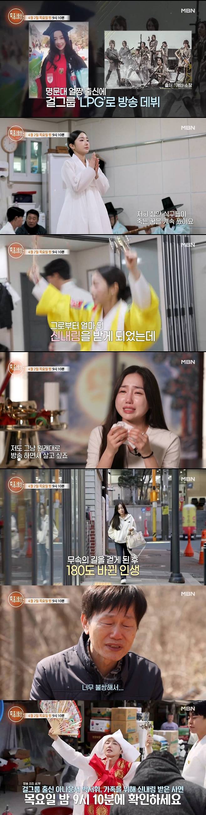 지난 1일 MBN '특종세상' 공식 채널에는 '걸그룹 출신 아나운서 박서휘, 가족 위해 신내림 받는 사연'이라는 제목의 선공개 영상이 공개됐다.