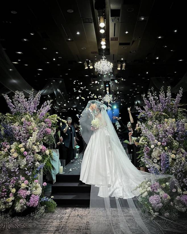 연보라색과 화이트 톤의 플라워 데코가 어우러진 배경은 남보라의 순수하고 우아한 분위기를 더욱 돋보이게 한다.