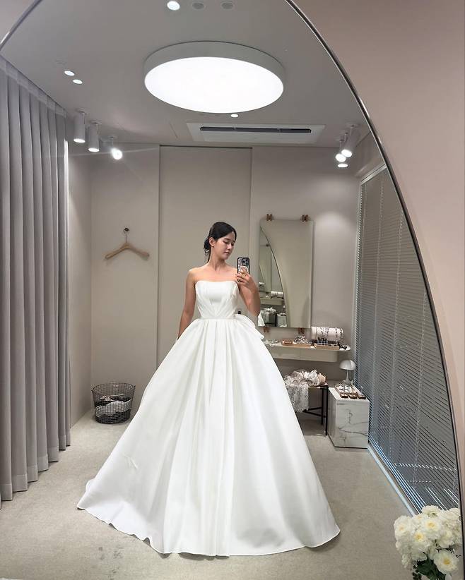 특히 어깨선을 드러내는 오프숄더 스타일은 그녀의 우아한 목선과 쇄골 라인을 강조하며, 깔끔하면서도 기품 있는 신부의 정석을 완성했다.