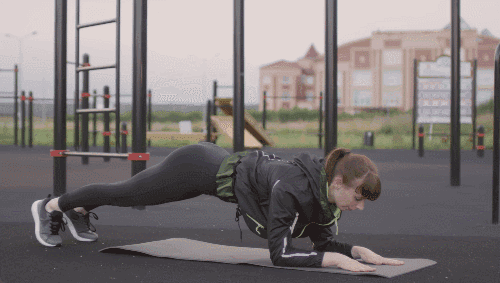 플랭크 기본자세로 엎드립니다. 왼쪽 무릎을 가슴 쪽으로 당기며 복부에 힘을 줍니다. 왼쪽 다리를 원래 위치로 되돌리며, 오른쪽 무릎을 가슴 쪽으로 당깁니다. 이 동작을 좌우 교차하며 반복합니다.