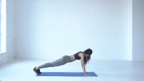 플랭크 기본자세로 매트 위에서 준비합니다. 왼쪽 팔꿈치를 구부려 팔꿈치 플랭크 자세로 이동합니다. 이어서 오른쪽 팔꿈치를 구부려 두 팔꿈치로 몸을 지탱합니다. 왼팔을 펴고, 이어서 오른팔을 펴며 원래 플랭크 자세로 돌아옵니다.