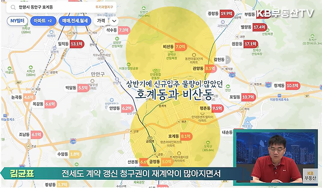 이 지역들은 최근 몇 년간 다른 지역보다 상승률이 높았는데요. 올해 들어서는 완전히 분위기가 반전돼 눈길을 끌고 있습니다. 세 지역을 좀 더 자세히 보겠습니다. 먼저 안양시 동안구는 2022년 상반기에 호계동과 비산동에 집중적으로 신규 입주물량이 발생했는데요. 전세도 계약갱신청구권 재계약이 많아지면서, 전세 신규 수요가 오히려 감소했습니다. 그러면서 전세 가격이 크게 하락하면서, 덩달아 매매 가격도 떨어졌습니다.