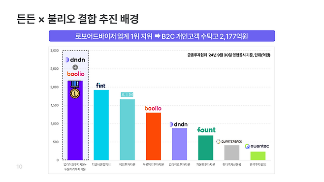 든든은 정적·동적 자산배분전략에 기반한 장기투자 상품을 기반으로 수탁고 3300억원, 활성 고객 수 1만명을 기록하고 있으며 불리오는 인공지능(AI) 퀀트·자산평가 기술력으로 수탁고 2000억원과 활성 고객 1만3000명을 보유하고 있다.