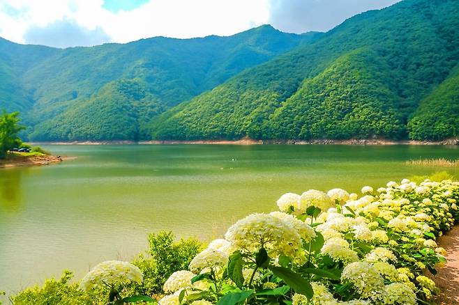 웅장한 산세가 병풍처럼 둘러싸고 있어 여름이면 짙은 녹음이 우거지고, 여름에는 수국이 만개합니다.