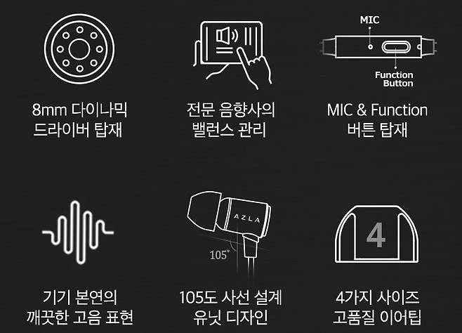 기본 특징은 다음과 같습니다. 8mm 다이나믹 드라이버 탑재와 음향 밸런스 그리고 105도 사설 선계 유닛 디자인으로 편안한 착용감 및 고품질 이어팁 동봉이 있습니다.