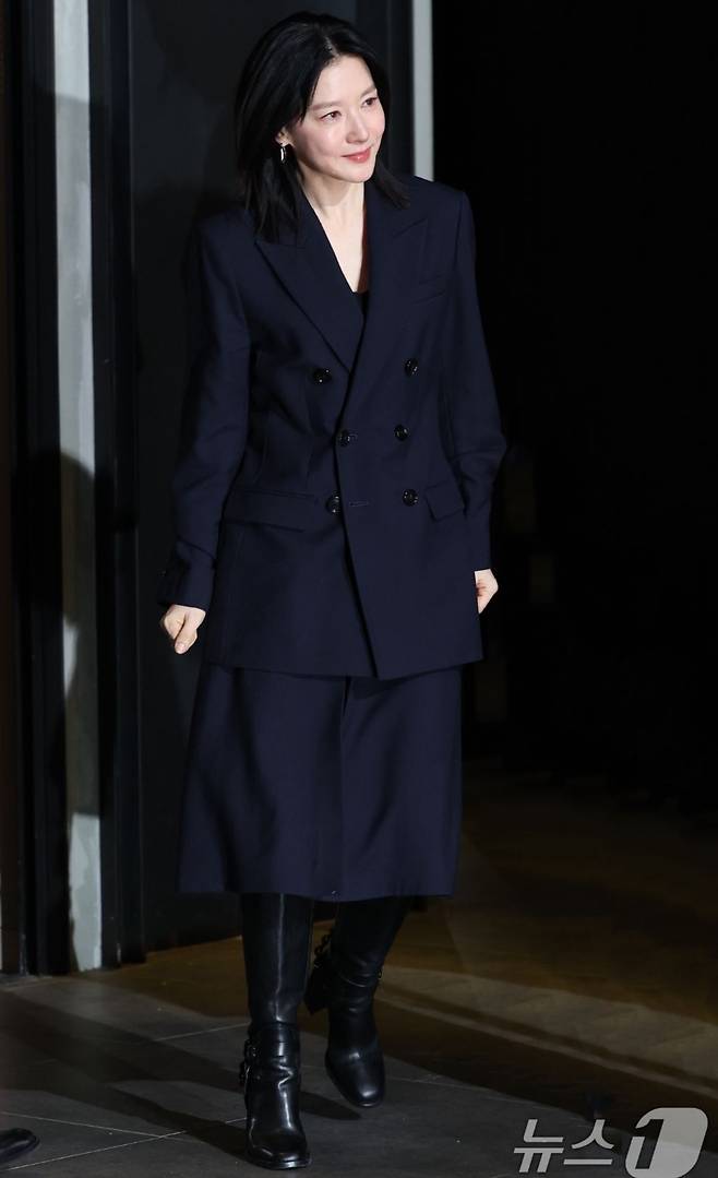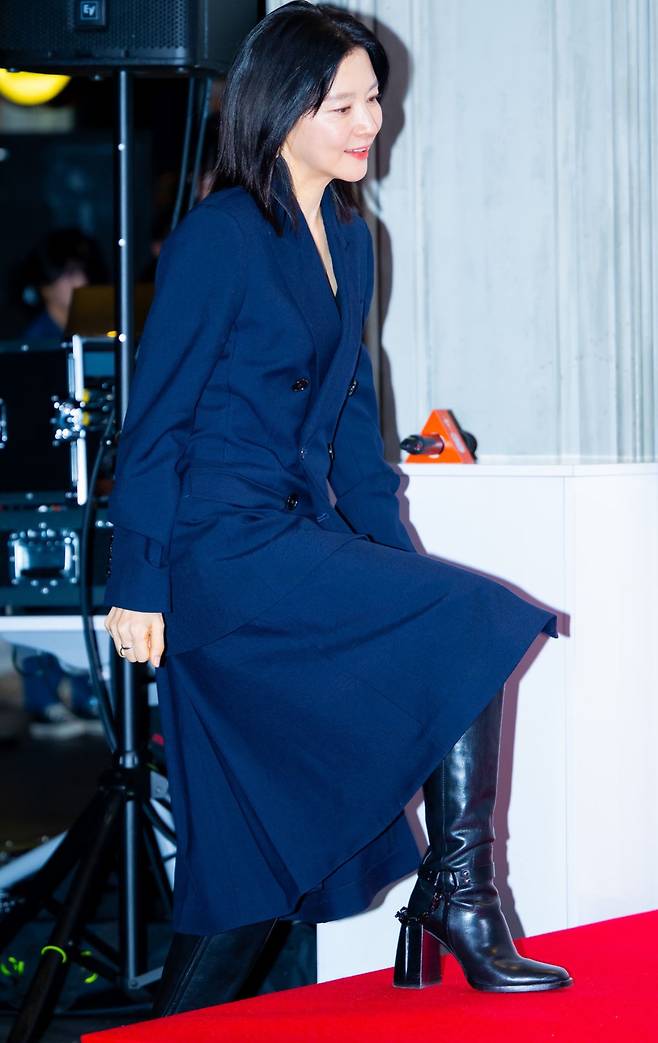 이영애 롱부츠코디에 함께 매치한 네이비 컬러의