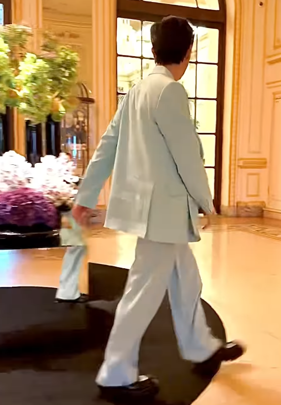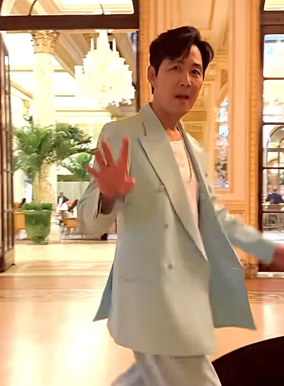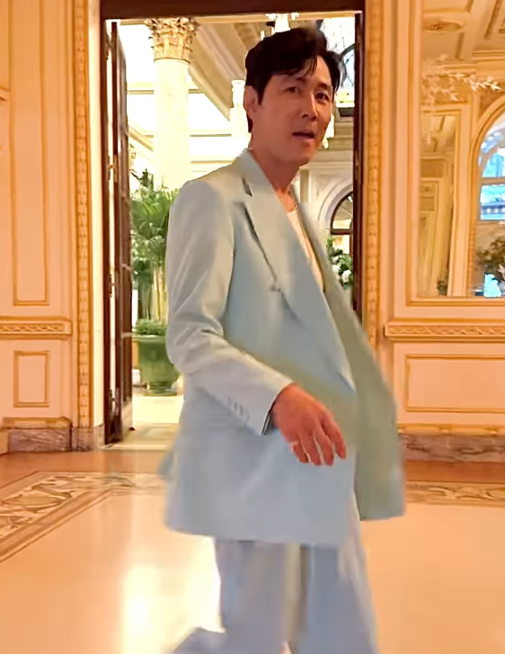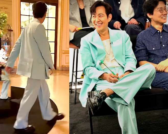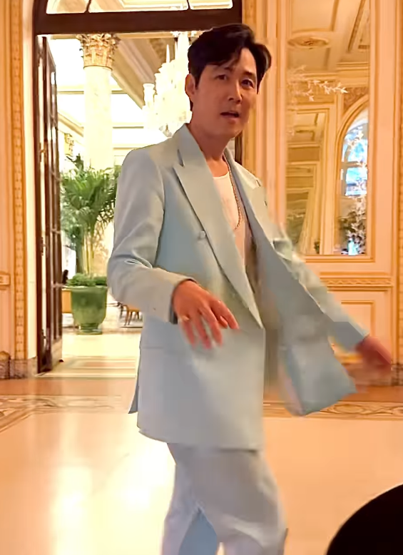 밝고 가벼운 톤의 블루 셋업은 고급스러우면서도 시원한 느낌을 줘 여름 시즌에 특히 돋보이는 선택이죠. 이정재 님은 여유 있는 핏의 수트를 통해 클래식과 캐주얼 사이의 완벽한 밸런스를 선보였어요.