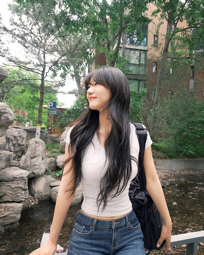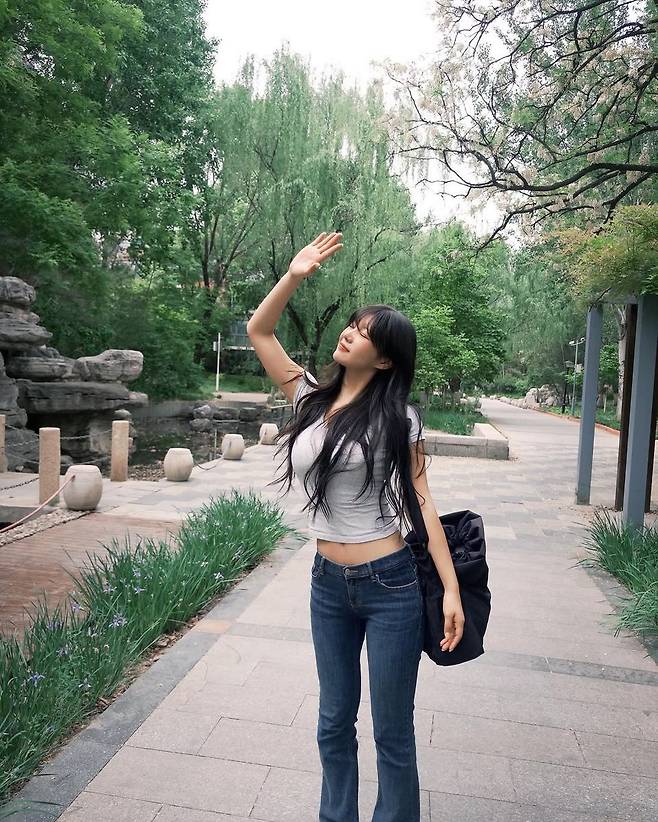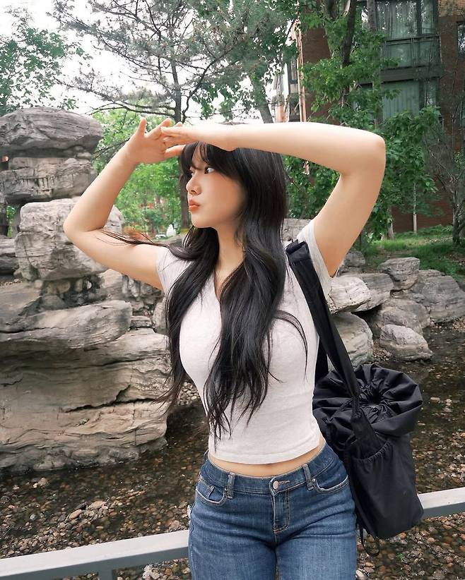 사진 속 추화정은 맑은 계곡과 바위 풍경을 배경으로 청량한 여름 분위기를 가득 담은 코디를 선보였다. 전체 룩은 ‘화이트 크롭티 + 데님 팬츠’라는 가장 기본적인 조합이지만, 그녀의 체형을 따라 슬림하게 떨어지는 핏 덕분에 단순함 속에서도 고급스러운 분위기를 완성했다.