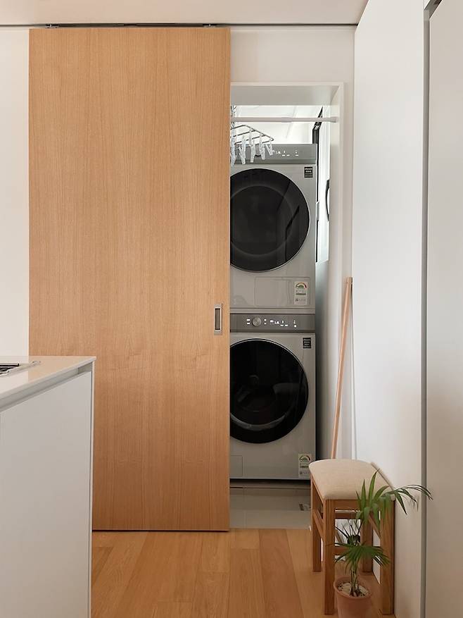 저희 집 세탁실은 주방 한 켠에 자리하고 있고 세탁기가 들어가면 남는 공간이 없을 만큼 아주 좁아요. 그래서 처음에는 이 공간에 어떻게 세탁물과 물건들을 보관할지 정말 난감했어요. 그리고 워낙 좁아서 문을 주방 쪽으로 열어야 하니 주방 공간까지 침범하게 되더라고요. 그래서 슬라이딩 도어를 설치해서 공간을 좀 더 효율적으로 사용할 수 있도록 했어요.