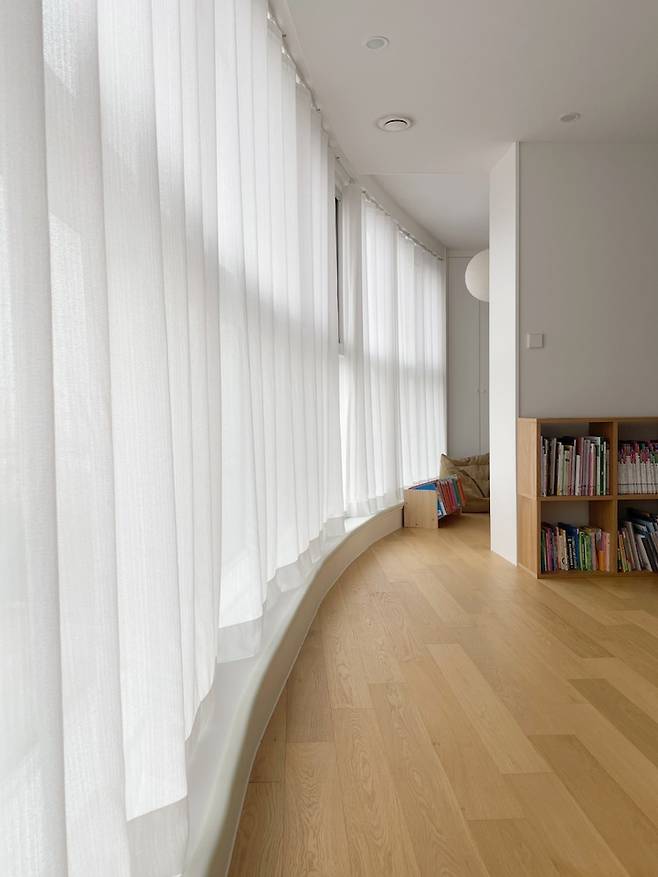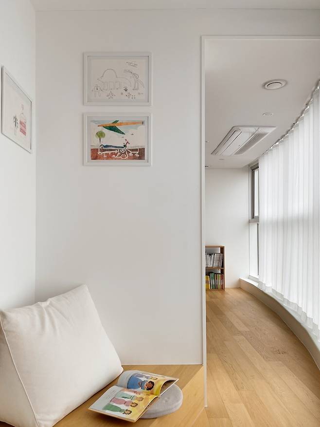 특이한 점이라면 거실과 안방 베란다에 라운드 형태의 커튼 월이 있다는 거였어요. 집을 보자마자 이 부분을 좀 더 재미있게 활용해 보면 좋겠다는 생각이 컸고, 아이들이 즐겁게 지낼 수 있는 공간을 만들어보고 싶었어요.