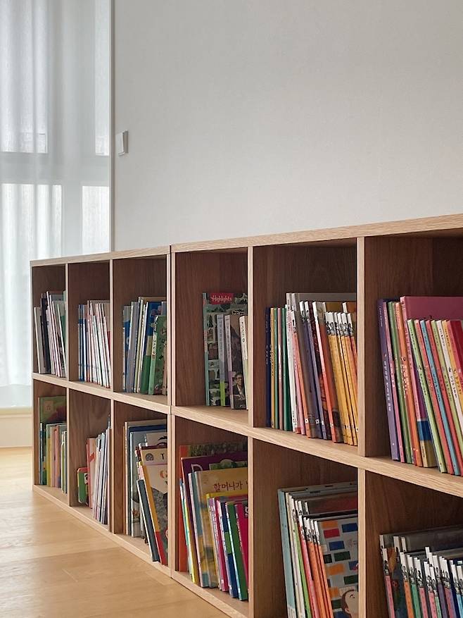 아이들 터울이 좀 있다 보니 책이 점점 더 많아지고 있어요. 첫째가 아기 때부터 읽던 책들을 이제 둘째가 보기 시작하니 비울 수도 없고 난감하더라고요. 그래서 거실 양 벽에 책을 두고 아이들이 자유롭게 꺼내볼 수 있게끔 책장을 마련해 주었어요.