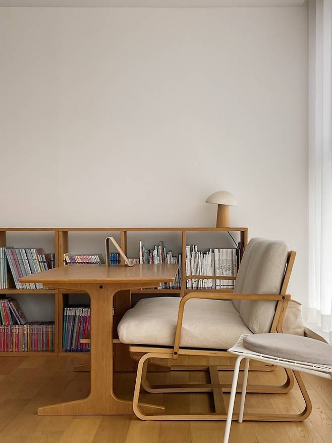 아이들의 책이 거의 대부분이라 손쉽게 꺼내 읽을 수 있도록 하고 싶었어요. 그리고 아이들이 공간을 좀 더 넓고 높게 느끼길 바라는 마음에 책장은 모두 2단으로 눕혀서 사용하고 있어요. 책장이 낮으니 아이들 시선에 책이 가득하면서도 공간이 답답해 보이지 않아서 좋은 것 같아요. 테이블 조명이나 빔을 올려두기에도 딱 좋은 높이에요.