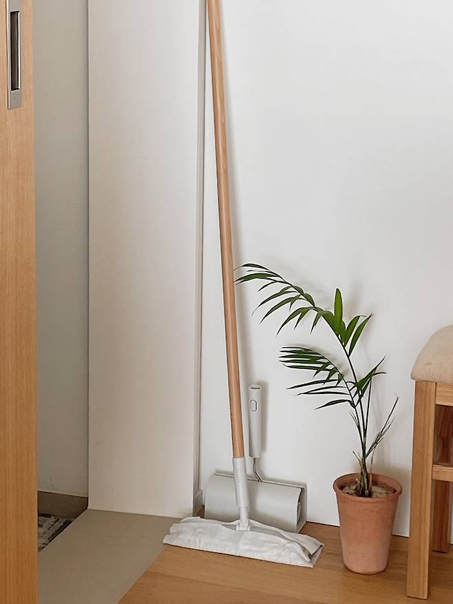 세탁실 앞에는 자주 사용하는 청소도구들을 두었어요. 주방 일을 하다가도 심심하면 가지고 나가서 슥슥 쓸어올 수 있도록 했어요. 전에 화장대에서 사용하던 의자를 함께 두어서 냉장고 위 수납장에서 물건을 꺼낼 때 사용하고 있어요. 요리가 완성되길 기다리면서 앉아서 쉬기에도 좋고 빨랫감을 갤 때도 여기에 앉아서 개곤 한답니다.
