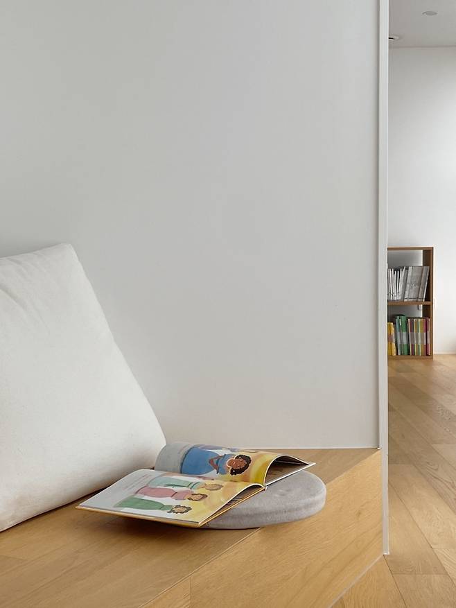 처음 집을 보러 갔을 때 꽤 넓은 베란다가 쓰임 없이 방치되어 있는 것이 너무 아쉬웠어요. 이곳이 아이들만의 아늑한 아지트가 되면 참 좋겠다는 생각이 들더라고요. 그래서 베란다를 확장하면서 평상을 만들어 아이들이 리딩 누크이자 놀이공간으로 활용할 수 있도록 만들어보았습니다.