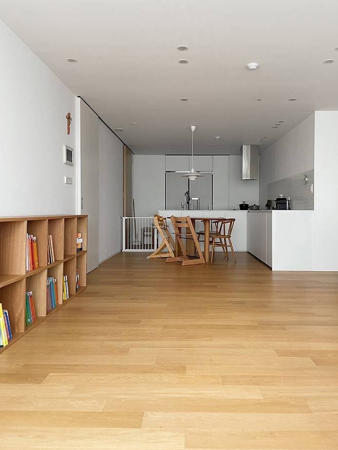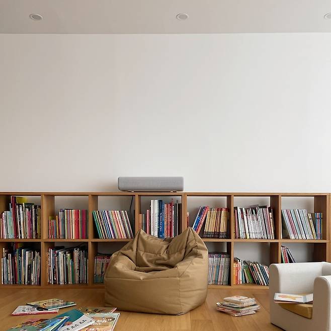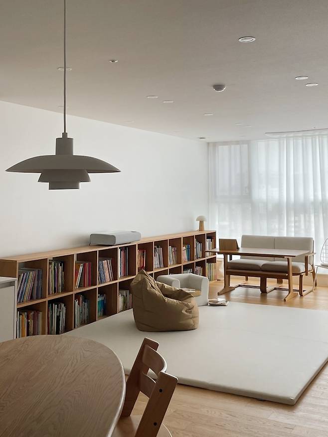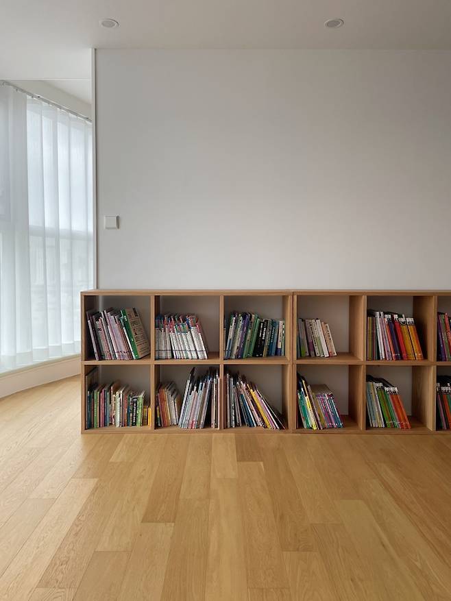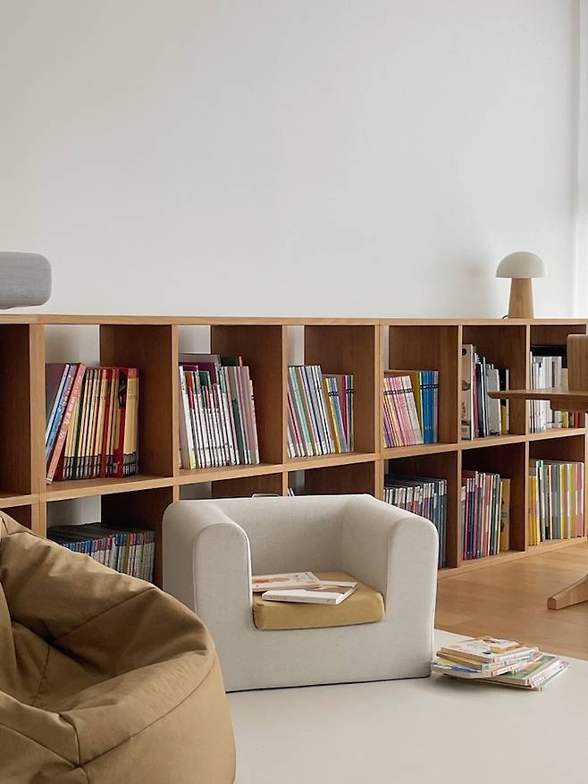 저희 부부는 심플하고 미니멀한 것을 좋아하는데 아이들의 책은 색감이 워낙 다채로워서 자칫 잘못하면 집이 너무 복잡해 보일 것 같았어요. 그래서 다른 장식은 두지 않고 책과 책장을 중심으로 거실을 꾸며보았습니다.