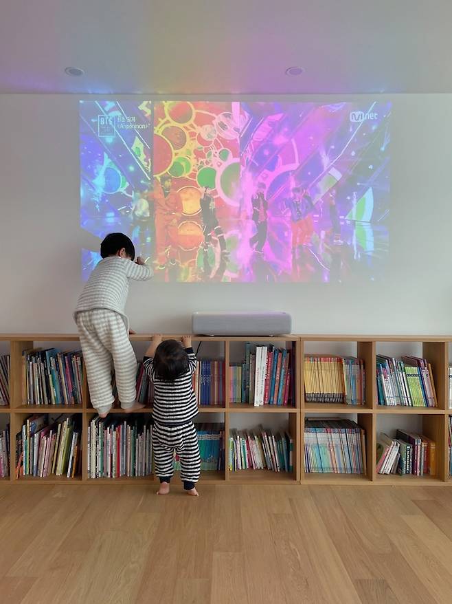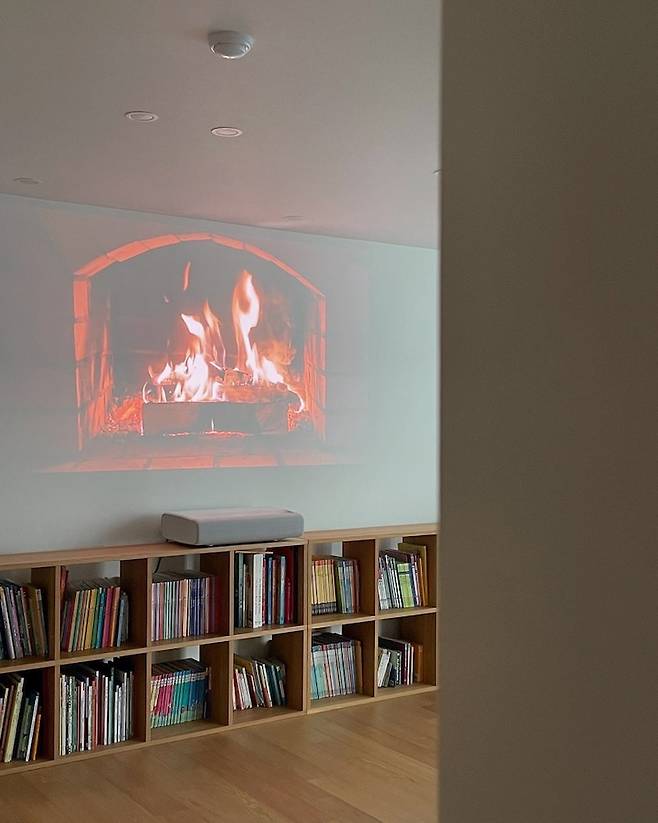 주말에는 아이들이랑 영화를 보거나 음악을 듣기도 하는데 밤에 빔프로젝터를 틀어놓고 있으면 꼭 영화관에 온 것 같은 기분이 들어요. 티비순이인 제가 TV를 포기할 수 있게 도와준, 서재형 거실의 일등공신이예요.